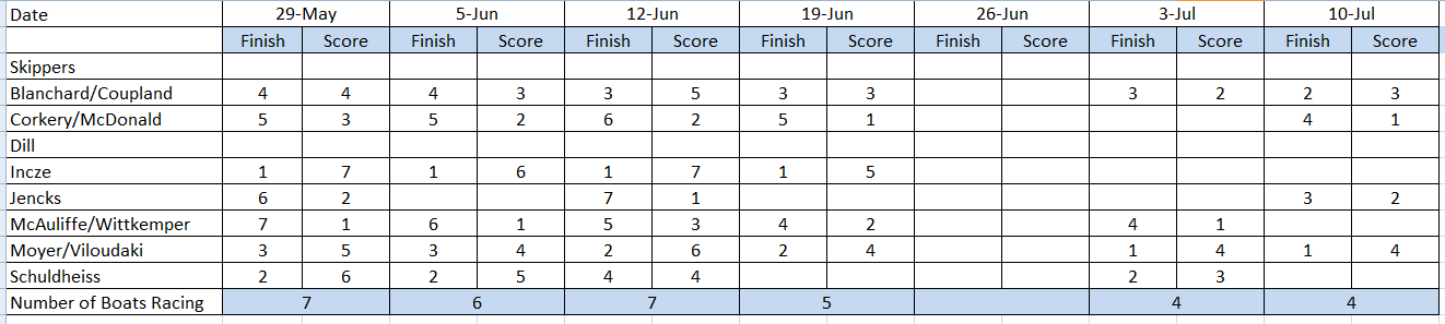 Results through 10 July, 2 races left in the spring series